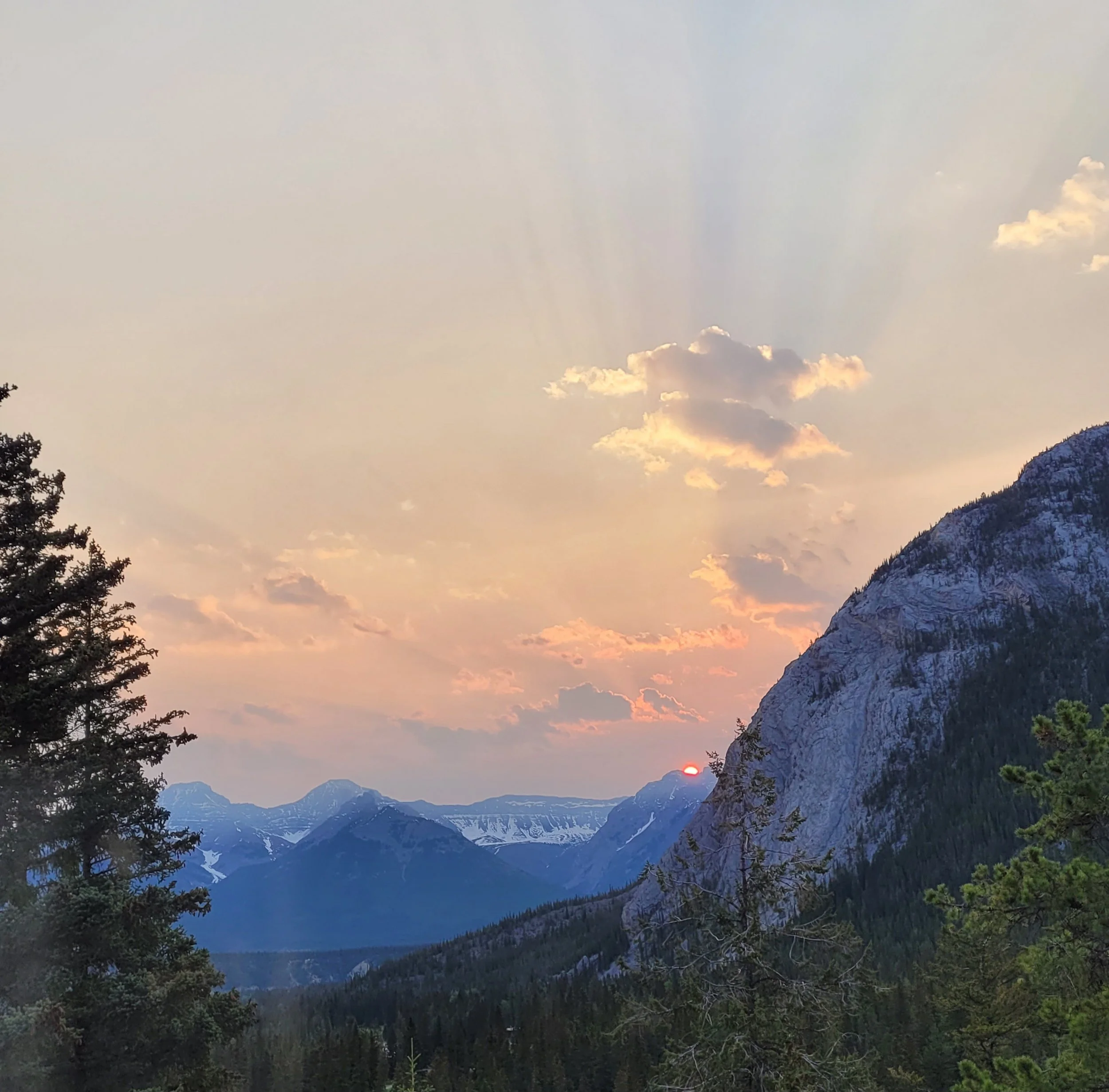 The morning sun peeks over a distant mountain peak casting warm pink light on the surrounding clouds